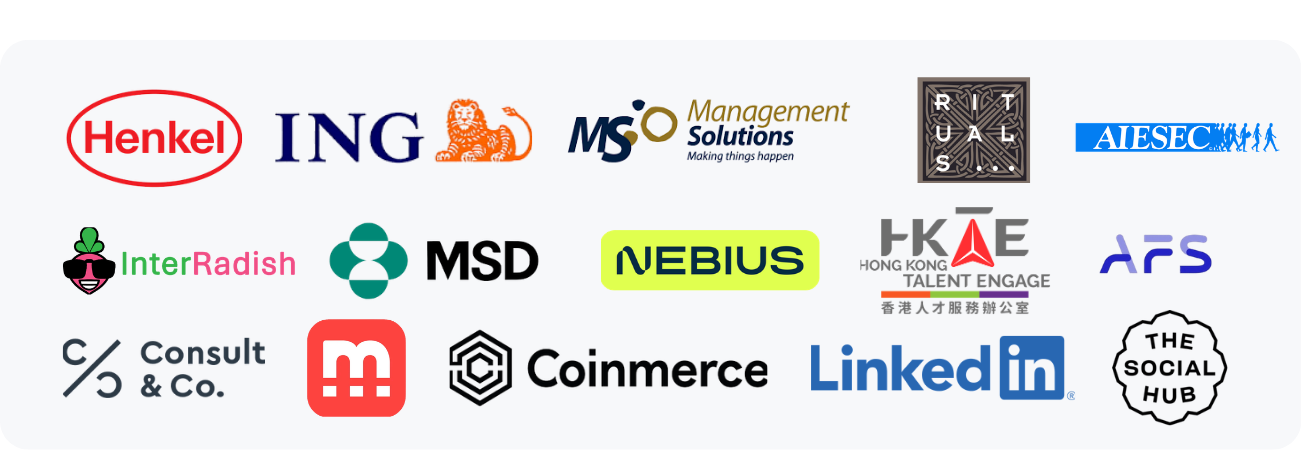 Participating organisations: ING, Nebius, Consult & Co, Henkel, Management Solutions, Rituals, InterRadish, MSD, Hong Kong Talent Engage, MagnetMe, Coinmerce, LinkedIn, Aiesec, The Social Hub, AFS